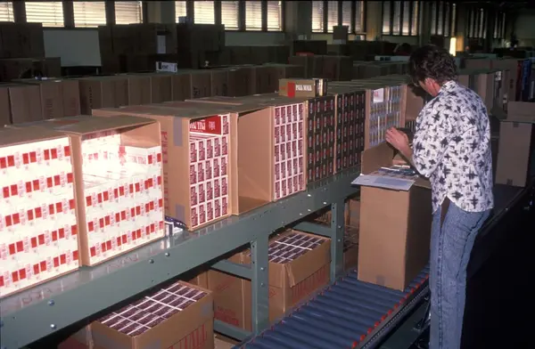 Fabrikkinteriør. Pakkeavdeling. Produksjon av tobakk hos Tiedemanns Tobaksfabrik.