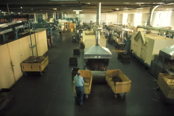 Fabrikkinteriør. Produksjon av tobakk hos Tiedemanns Tobaksfabrik.