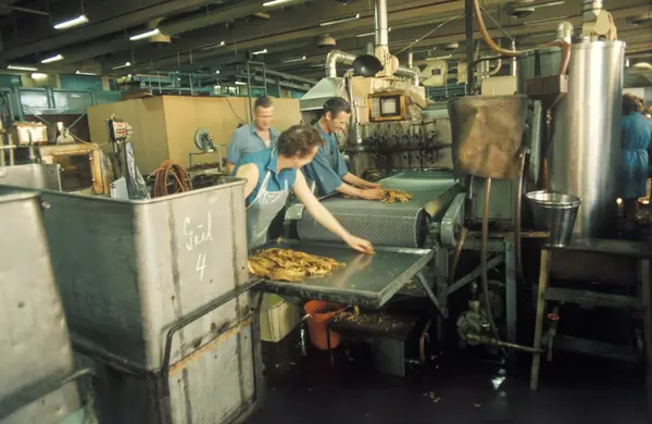 Fabrikkinteriør. Sprenking av røyketobakk. Produksjon av tobakk hos Tiedemanns Tobaksfabrik på Hovin.