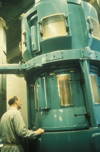 Fabrikkinteriør. Tresking av tobakk. Produksjon av sigaretter hos Tiedemanns Tobaksfabrik på Hovin.