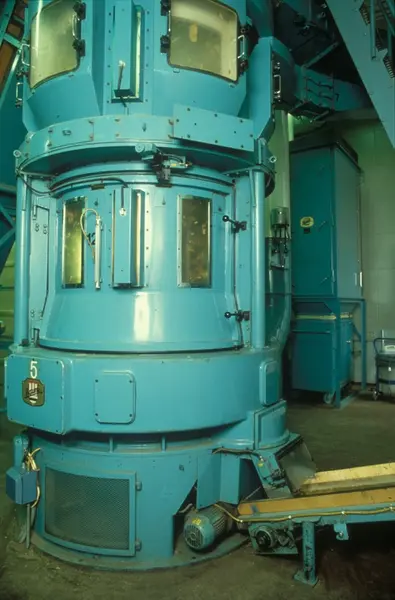 Fabrikkinteriør. Tresking av tobakk. Produksjon av sigaretter hos Tiedemanns Tobaksfabrik på Hovin.