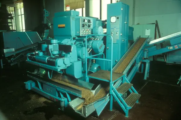 Fabrikkinteriør. Skjæring av stilk. Produksjon av sigaretter hos Tiedemanns Tobaksfabrik på Hovin.