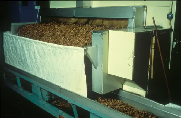 Fabrikkinteriør. Toasting av burley. Produksjon av sigaretter hos Tiedemanns Tobaksfabrik på Hovin.