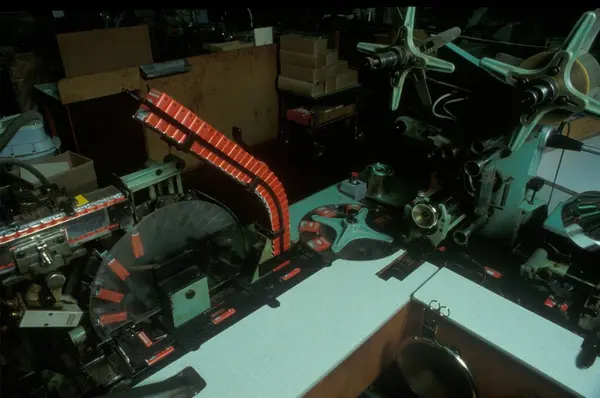 Fabrikkinteriør. Sigarettpakkemaskin. Produksjon av sigaretter hos Tiedemanns Tobaksfabrik på Hovin.