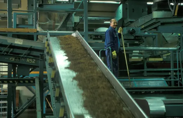 Fabrikkinteriør. Produksjon av tobakk hos Tiedemanns Tobaksfabrik på Hovin.