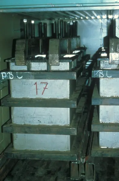 Fabrikkinteriør. Pressekasser i varmeskap. Produksjon av røyketobakk hos Tiedemanns Tobaksfabrik.