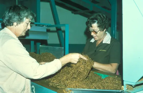 Fabrikkinteriør. Produktkontroll. Produksjon av røyketobakk hos Tiedemanns Tobaksfabrik.