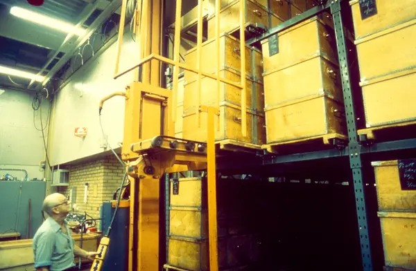 Fabrikkinteriør. Innsetting i snittlager og regnskap. Produksjon av røyketobakk hos Tiedemanns Tobaksfabrik.