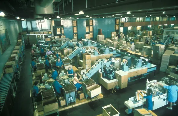 Fabrikkinteriør. Produksjon av røyketobakk hos Tiedemanns Tobaksfabrik.