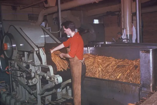 Fabrikkinteriør. Produksjon av røyketobakk hos Tiedemanns Tobaksfabrik. Fra Tiedemanns kursmateriell "Fra plantasjen til pipen".