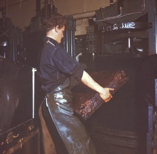 Fabrikkinteriør. Produksjon av røyketobakk hos Tiedemanns Tobaksfabrik. Fra Tiedemanns kursmateriell "Fra plantasjen til pipen".