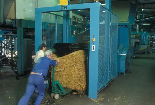 Fabrikkinteriør. Røyketobakk tilberedning. Produksjon av tobakk hos Tiedemanns Tobaksfabrik på Hovin. Fra billedserie laget i forbindelse med Tiedemanns interne tobakkskurs.