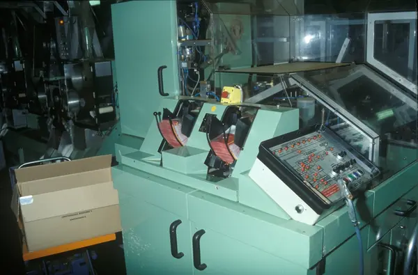 Fabrikkinteriør. Pakkeavdeling røyketobakk. Produksjon av tobakk hos Tiedemanns Tobaksfabrik på Hovin. Fra billedserie laget i forbindelse med Tiedemanns interne tobakkskurs.