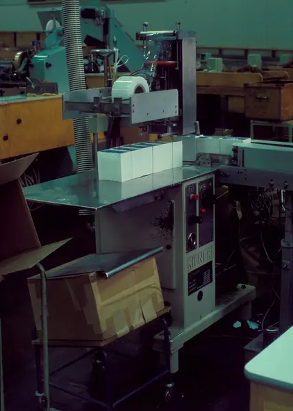 Fabrikkinteriør. Pakkeavdeling røyketobakk. Produksjon av tobakk hos Tiedemanns Tobaksfabrik på Hovin. Fra billedserie laget i forbindelse med Tiedemanns interne tobakkskurs.