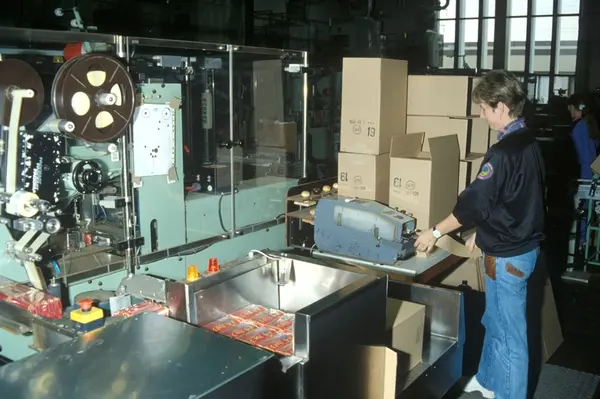 Fabrikkinteriør. Pakkeavdeling røyketobakk. Produksjon av tobakk hos Tiedemanns Tobaksfabrik på Hovin. Fra billedserie laget i forbindelse med Tiedemanns interne tobakkskurs.