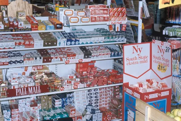 Butikkinteriør hos Hellerud matsenter. Vareplassering av tobakk.