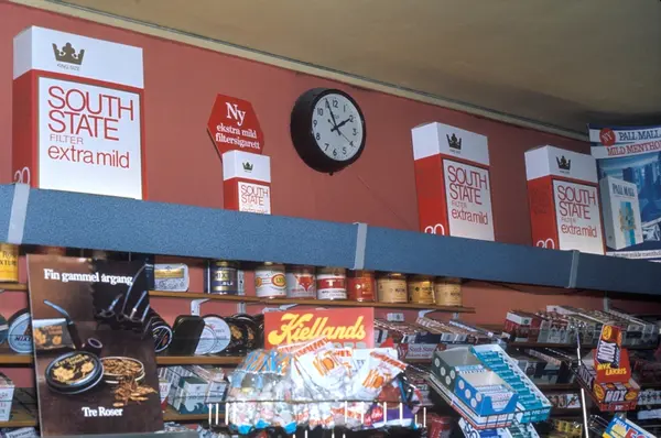 Butikkinteriør hos Pips tobakk i Oslo. Reklame for South State sigaretter.