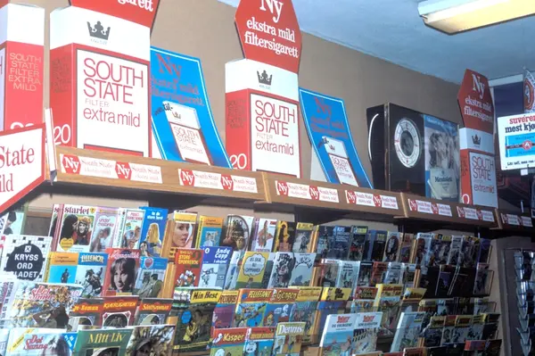 Butikkinteriør hos Fontenen tobakk på Tåsen. Reklameplakater for South State.