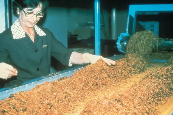 Fabrikkinteriør. Produktkontroll. Produksjon av tobakk hos Tiedemanns Tobaksfabrik på Hovin. Fra billedserie til finsk kurs om gode råd for oppbevaring av tobakk fra 1981.