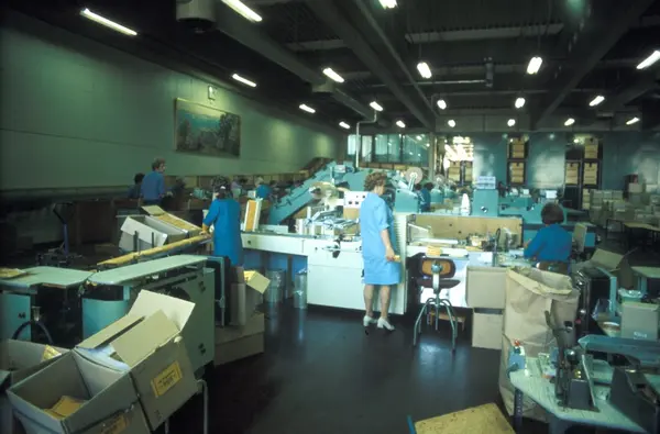 Fabrikkinteriør. Produksjon av tobakk hos Tiedemanns Tobaksfabrik. Fra billedserie til bruk ved presentasjon av Stjernesnitt sigaretter.