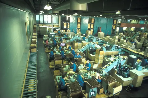 Fabrikkinteriør. Produksjon av tobakk hos Tiedemanns Tobaksfabrik. Fra billedserie til bruk ved presentasjon av Stjernesnitt sigaretter.