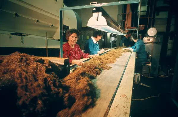 Fabrikkinteriør. H. Petterøe tobakksfabrikk, plukk av stilk i avdeling for røyketobakk tilberedning. Bildeserie i forbindelse med presentasjon av Petterøes tobakk i 1970.
