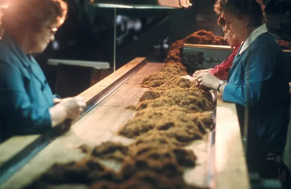 Fabrikkinteriør. H. Petterøe tobakksfabrikk, plukk av stilk i avdeling for røyketobakk tilberedning. Bildeserie i forbindelse med presentasjon av Petterøes tobakk i 1970.