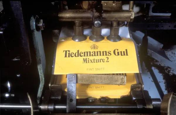 Fabrikkinteriør. Pakkeavdeling røyketobakk. Reklamefoto fra produksjon av Tiedemanns Gul mix tobakk. Billedserie til Tiedemanns Gul Mix eksportprogram fra 1980.