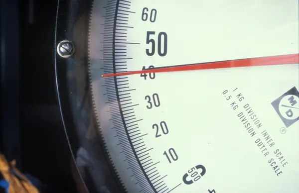 Fabrikkinteriør. Pakkeavdeling røyketobakk. Reklamefoto av veiing av tobakk i fabrikk. Billedserie til Tiedemanns Gul Mix eksportprogram fra 1980.