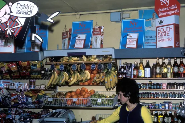 Butikkinteriør. Pips Tobakk. Reklame for South State sigaretter.