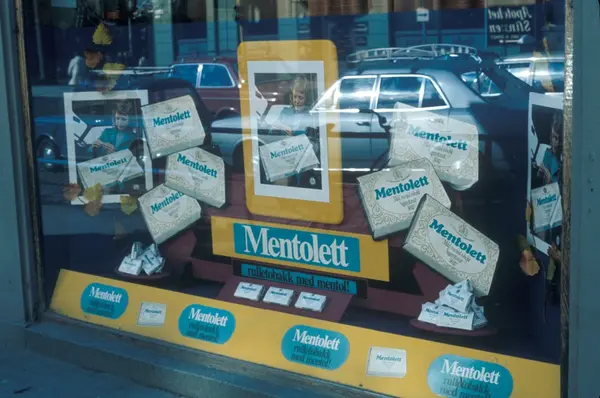Majoren tobakk. Reklame for Mentolett mentol tobakk i vinduet.