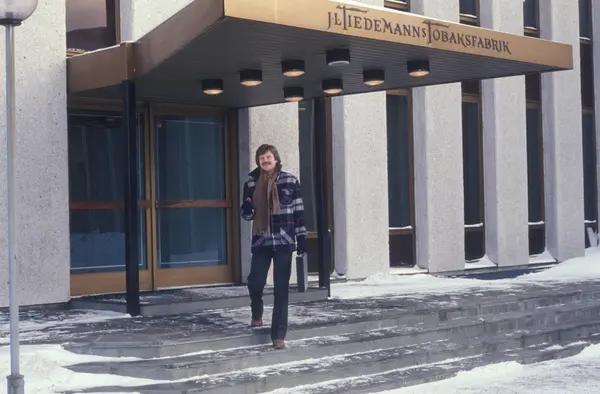 Reklamefoto av mann på vei ut fra Tiedemanns Tobaksfabrik. Reklamefoto fra presentasjon i forbindelse med introduksjon av Prince Mild i Norge i 1979.