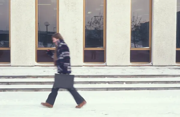 Reklamefoto av mann på vei bort fra Tiedemanns Tobaksfabrik. Reklamefoto fra presentasjon i forbindelse med introduksjon av Prince Mild i Norge i 1979.