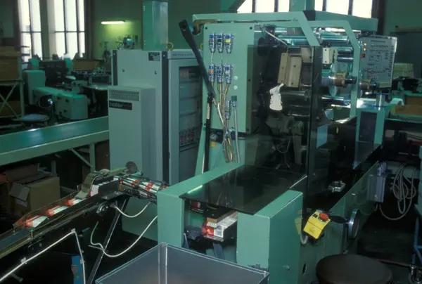 Fabrikkinteriør. Sigarettpakkemaskin til 20-pakning. Prince sigaretter. Produksjon av tobakk hos Tiedemanns Tobaksfabrik.