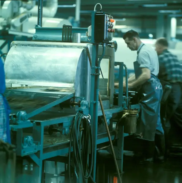 Fabrikkinteriør. Sprenking av tobakk. Produksjon av tobakk hos Tiedemanns Tobaksfabrik.