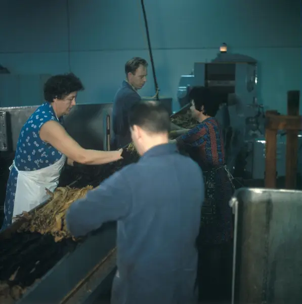 Fabrikkinteriør. Røyketobakk inn i skjæremaskin. Produksjon av tobakk hos Tiedemanns Tobaksfabrik.
