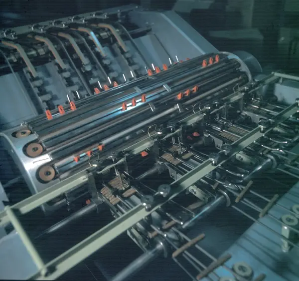 Fabrikkinteriør. Presse og pakkemaskin til sigarer. Produksjon av tobakk hos Tiedemanns Tobaksfabrik.