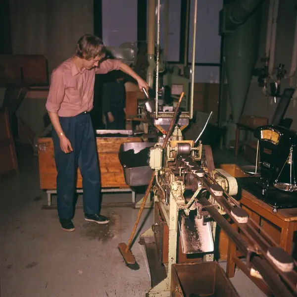 Fabrikkinteriør. Snuspakking. Produksjon av tobakk hos Tiedemanns Tobaksfabrik.