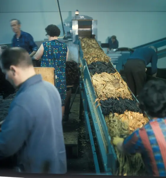Fabrikkinteriør. Skjæring av røyketobakk. Produksjon av tobakk hos Tiedemanns Tobaksfabrik.