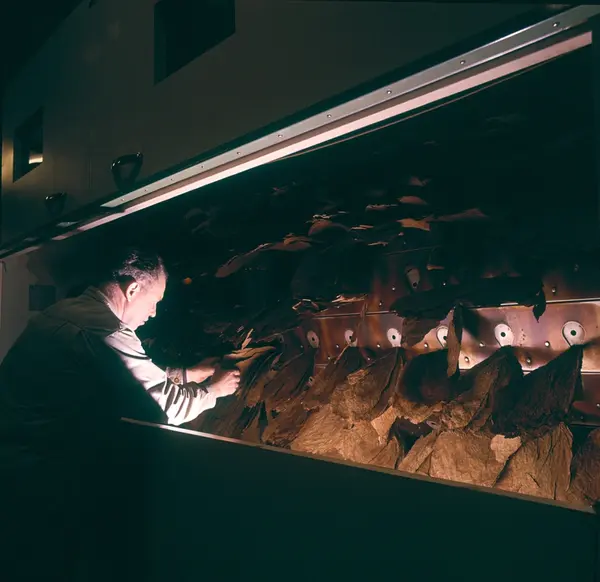 Fabrikkinteriør. Sigaravdeling, fukting av dekkblader. Produksjon av tobakk hos Tiedemanns Tobaksfabrik.