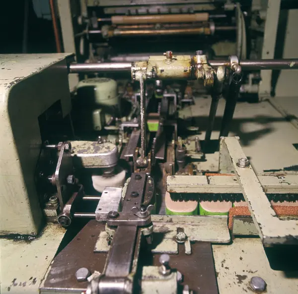 Fabrikkinteriør. Remsemaskin. Produksjon av snus hos Tiedemanns Tobaksfabrik.