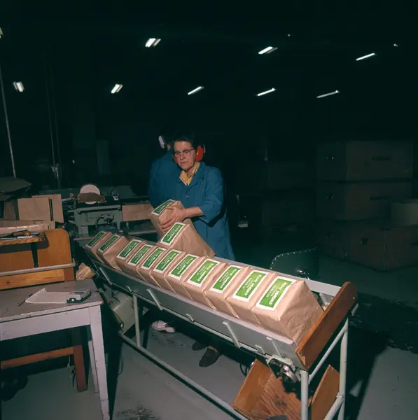 Fabrikkinteriør. Ferdig pakket snus legges på pall. Produksjon av snus hos Tiedemanns Tobaksfabrik.