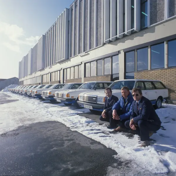 Selgere fra Tiedemann foran fabrikken på Hovin. Nye biler til salgsavdelingen i ca 1980.