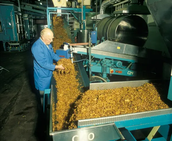 Fabrikkinteriør. Lys Virginia sigarettobakk etter fukting/sausing på vei til forblandebinge, før skjæring. Produksjon av tobakk ved Tiedemanns Tobaksfabrik.
