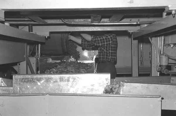Fabrikkinteriør. Tobakken på vei ut etter sprenking. Produksjon av tobakk hos Tiedemanns Tobaksfabrik i 1969