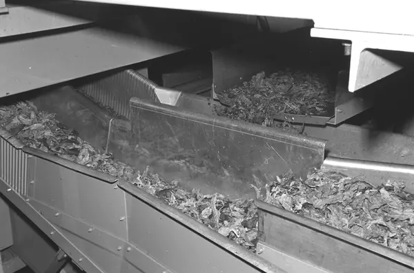 Fabrikkinteriør. Tobakken etter sprenking (sausing). Produksjon av tobakk hos Tiedemanns Tobaksfabrik i 1969