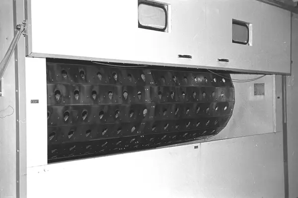 Fabrikkinteriør. Fuktehuset. Første trinn i produksjon av tobakk hos Tiedemanns Tobaksfabrik i 1969