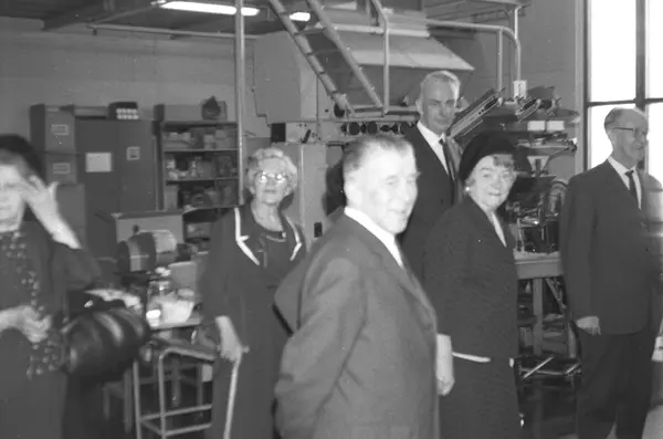 Fabrikkinteriør. Gruppe med mennesker på omvisning i fabrikk i 1969. Produksjon av tobakk hos Tiedemanns Tobaksfabrik.