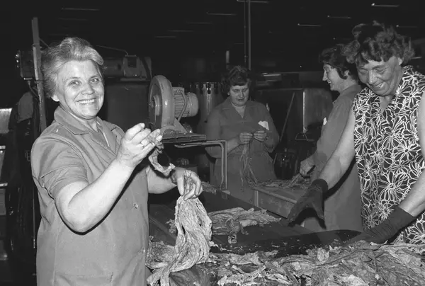 Fabrikkinteriør. Etter første fukteprosess, vakumkammer, fjernes tippen. Gruppe med mennesker på omvisning i fabrikk i 1969. Produksjon av tobakk hos Tiedemanns Tobaksfabrik.