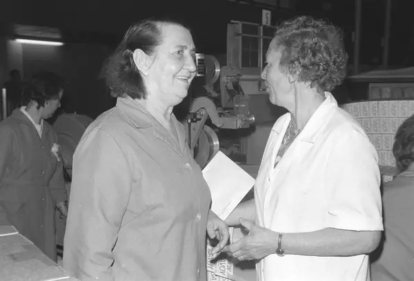 Fabrikkinteriør. Pakkeavdeling sigaretter. Gruppe med mennesker på omvisning i fabrikk i 1969. Produksjon av tobakk hos Tiedemanns Tobaksfabrik.